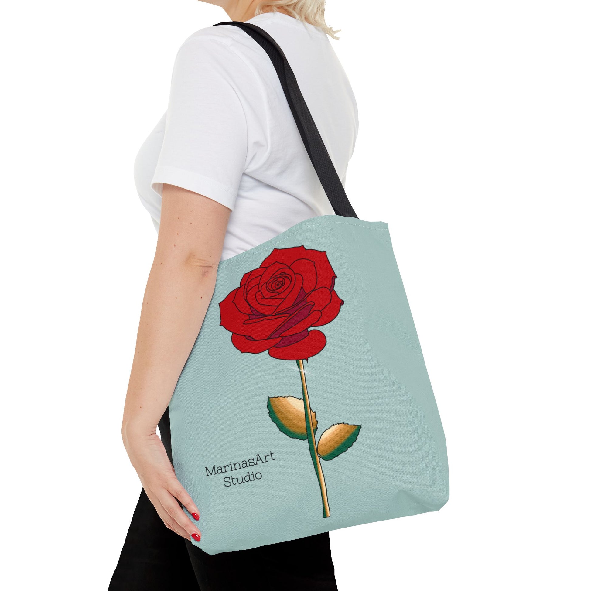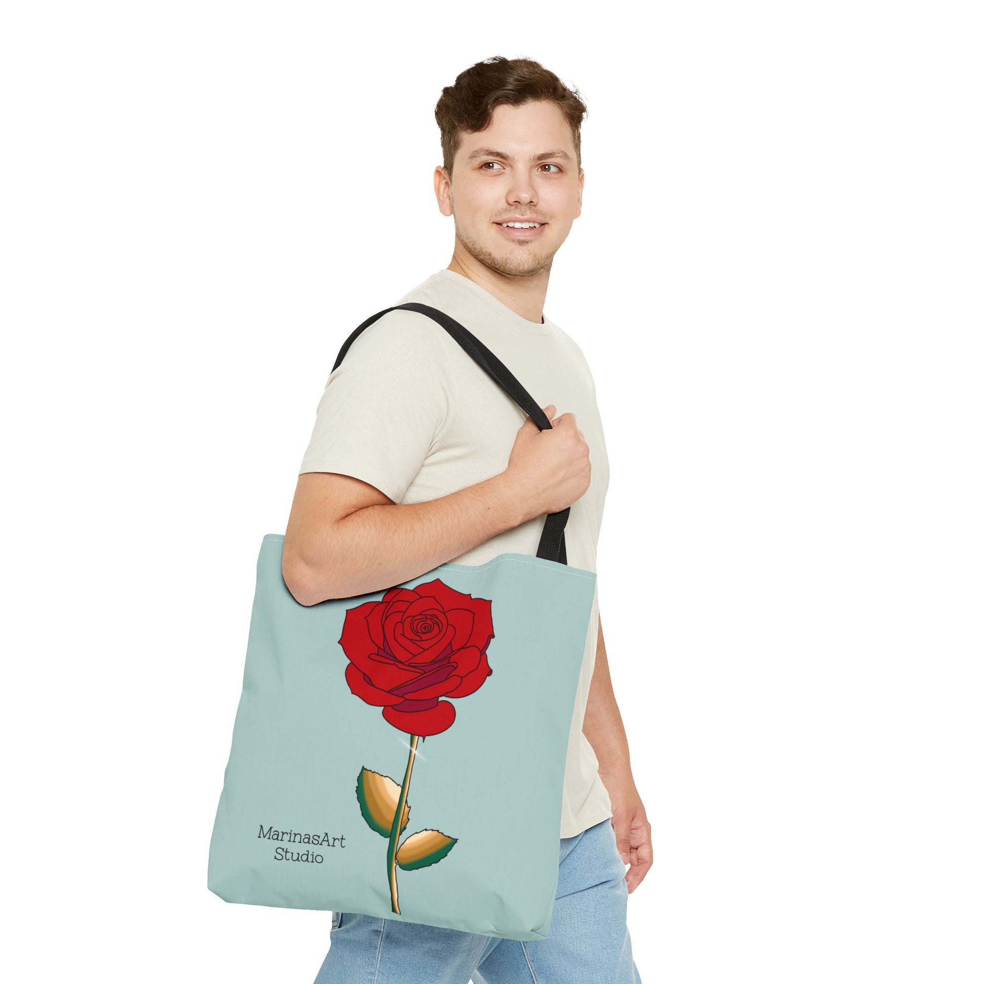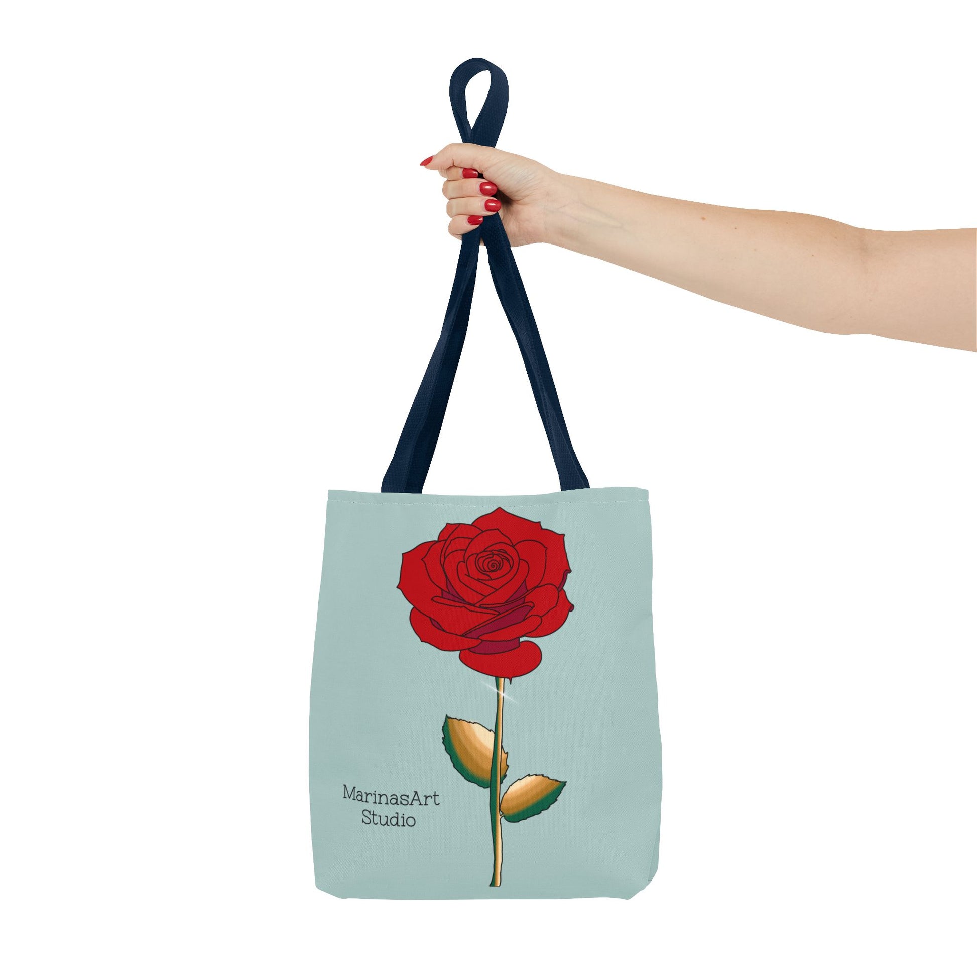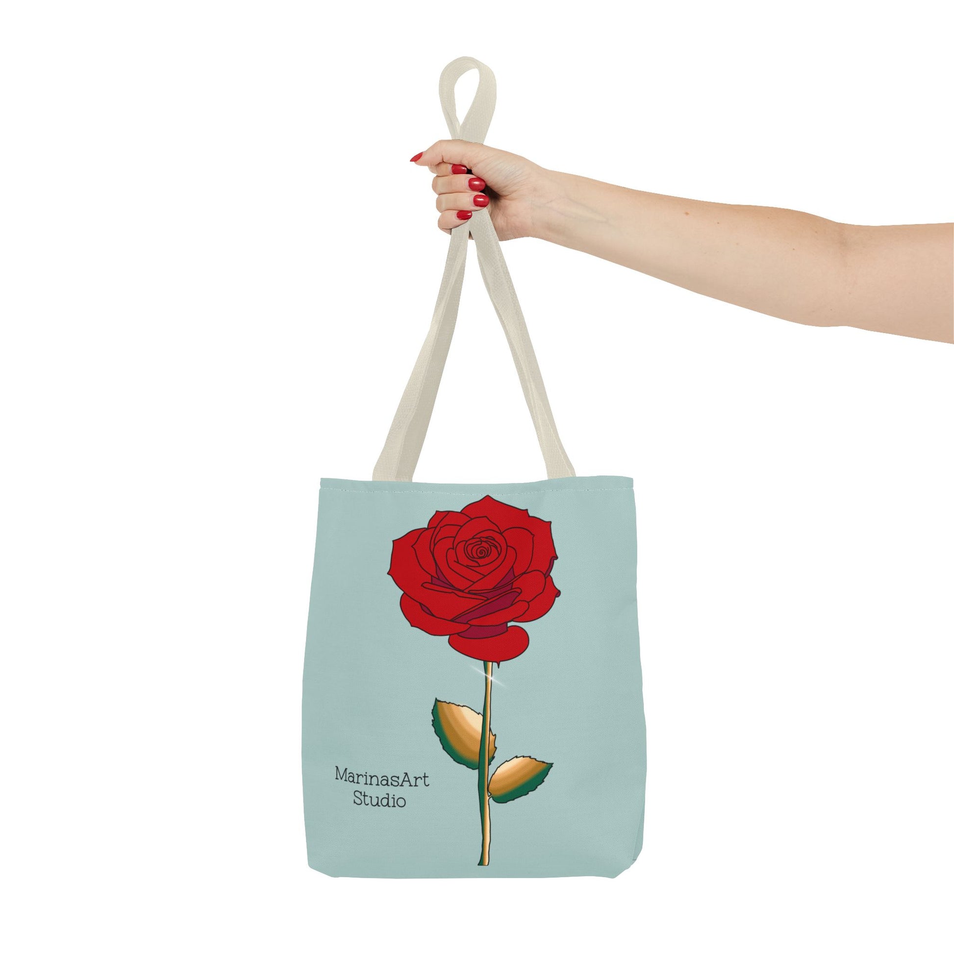 Available in 3 sizes to add both functionality and style, this ruby red rose tote bag comes in multiple handle colors that compliments the design. Made with spun polyester, these bags feature double-stitched seams, cotton webbing straps, and nonwoven laminate lining for high-end durability. It is perfect for all beach trips, shopping excursions, etc. Handle colors come in beige, black, navy blue, and white.