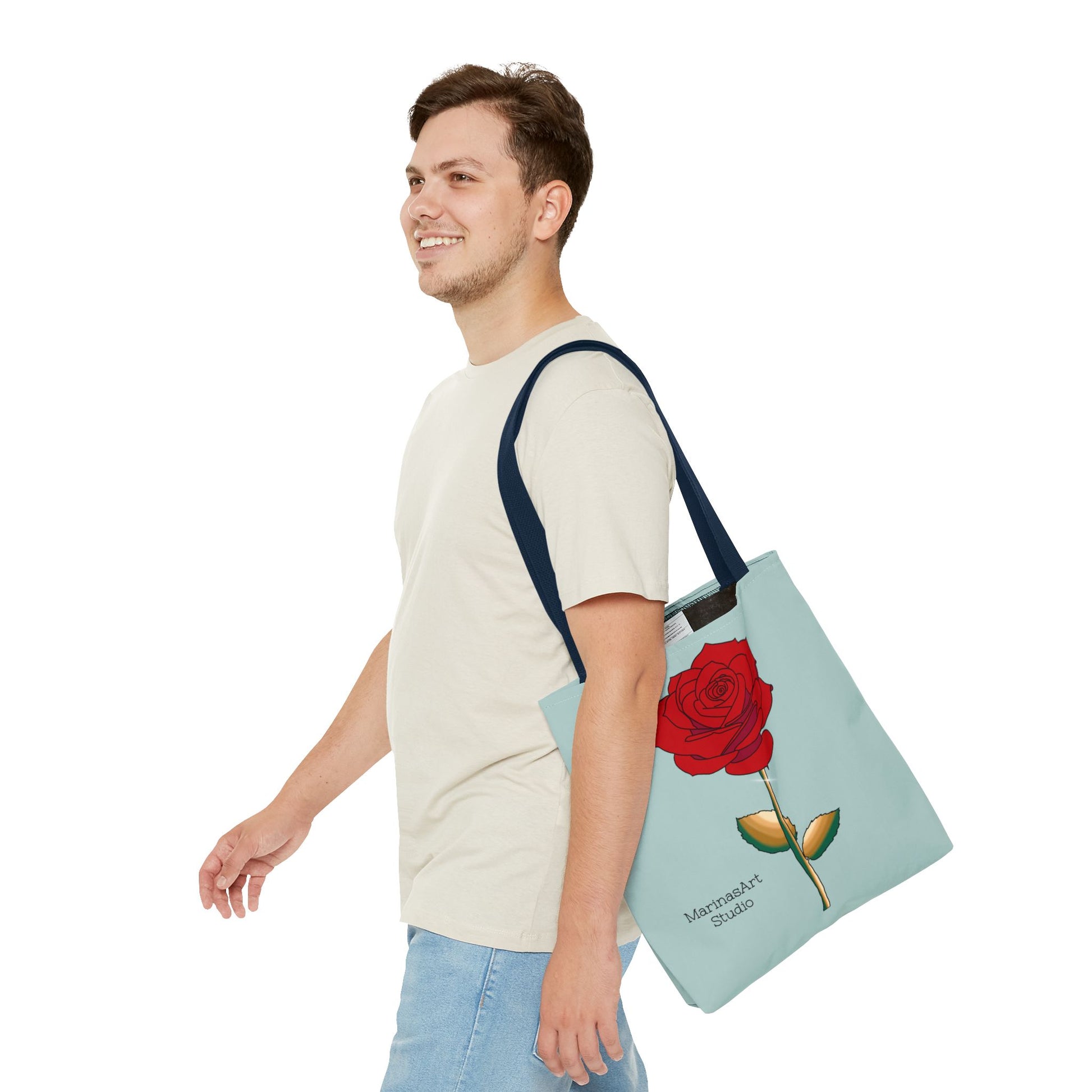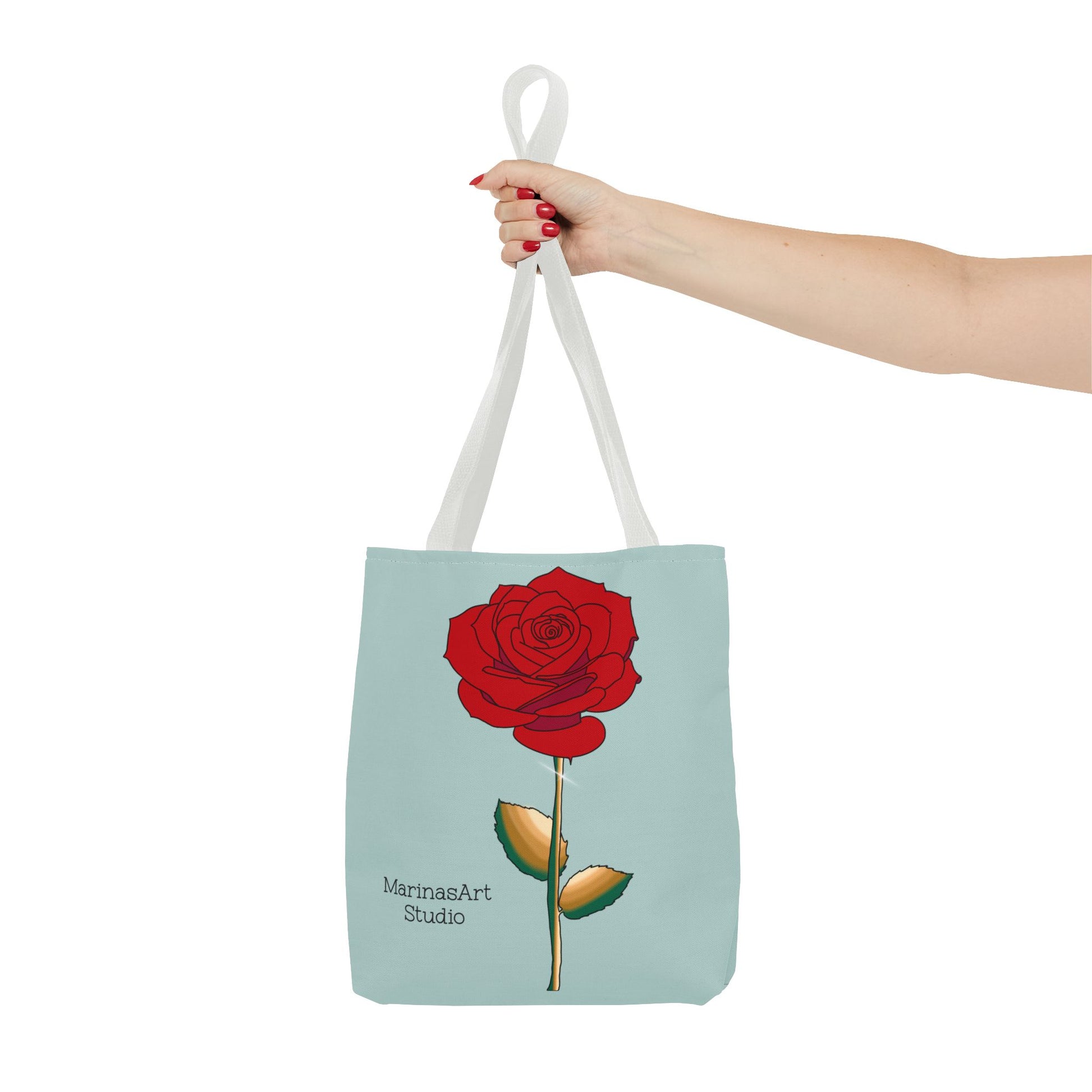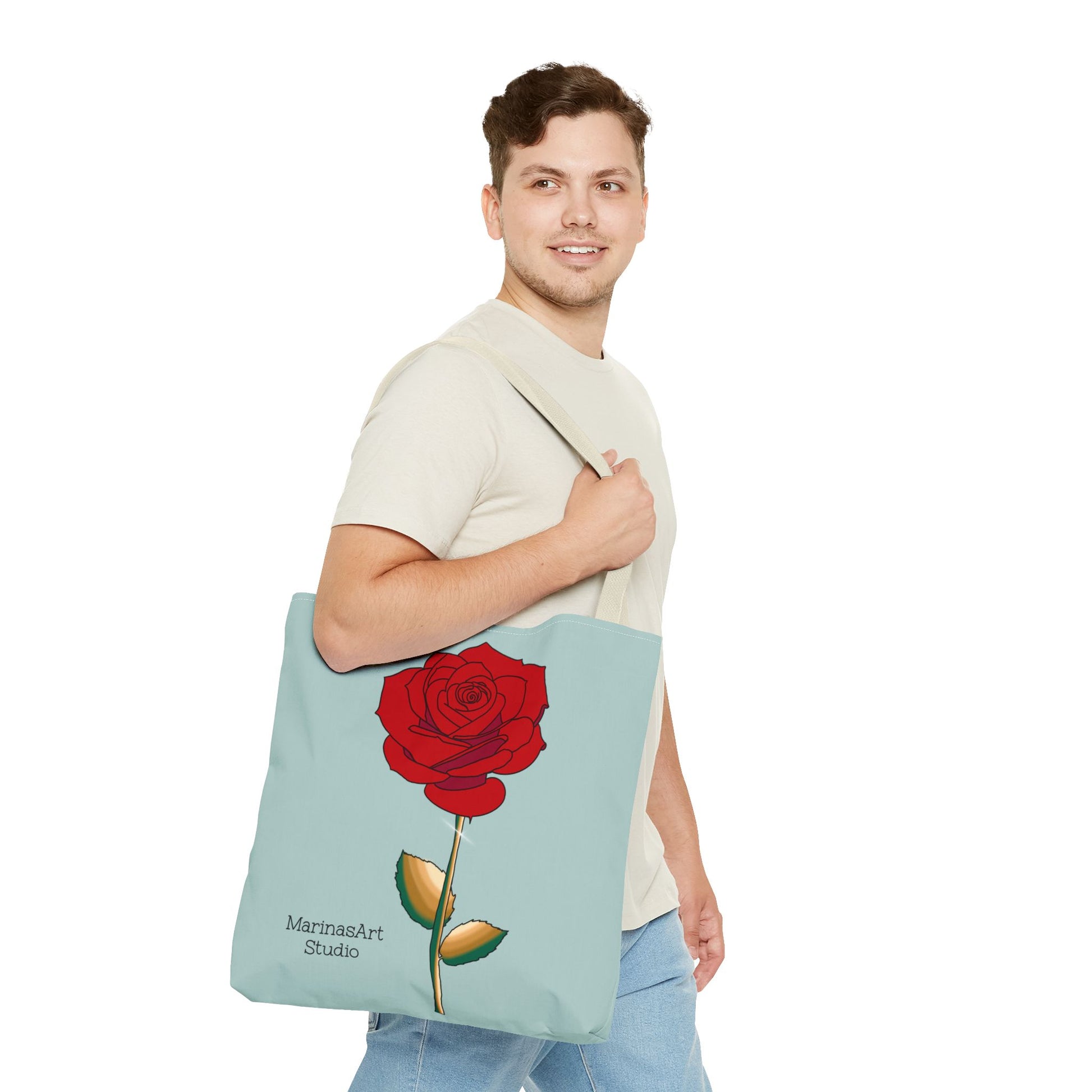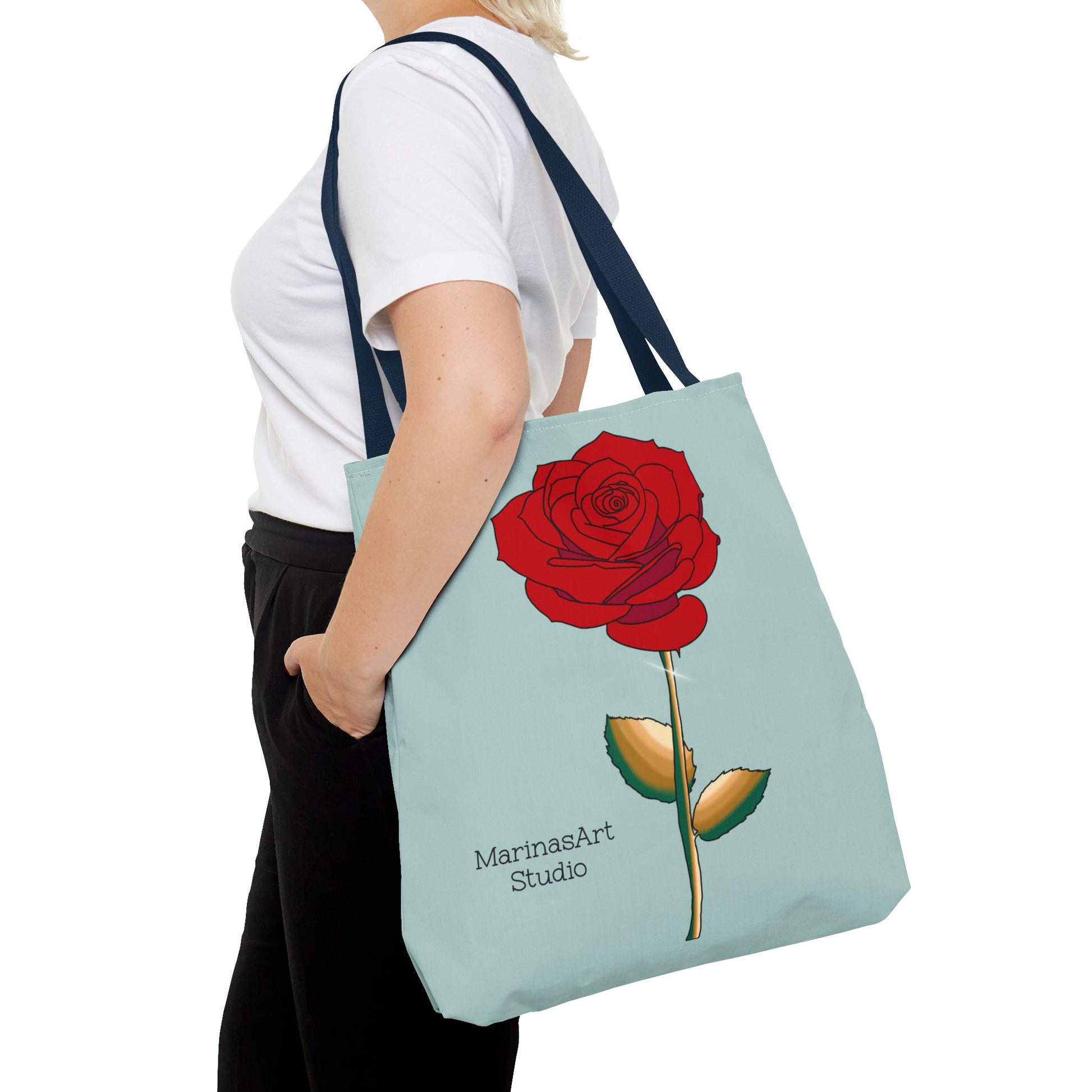 Available in 3 sizes to add both functionality and style, this ruby red rose tote bag comes in multiple handle colors that compliments the design. Made with spun polyester, these bags feature double-stitched seams, cotton webbing straps, and nonwoven laminate lining for high-end durability. It is perfect for all beach trips, shopping excursions, etc. Handle colors come in beige, black, navy blue, and white.