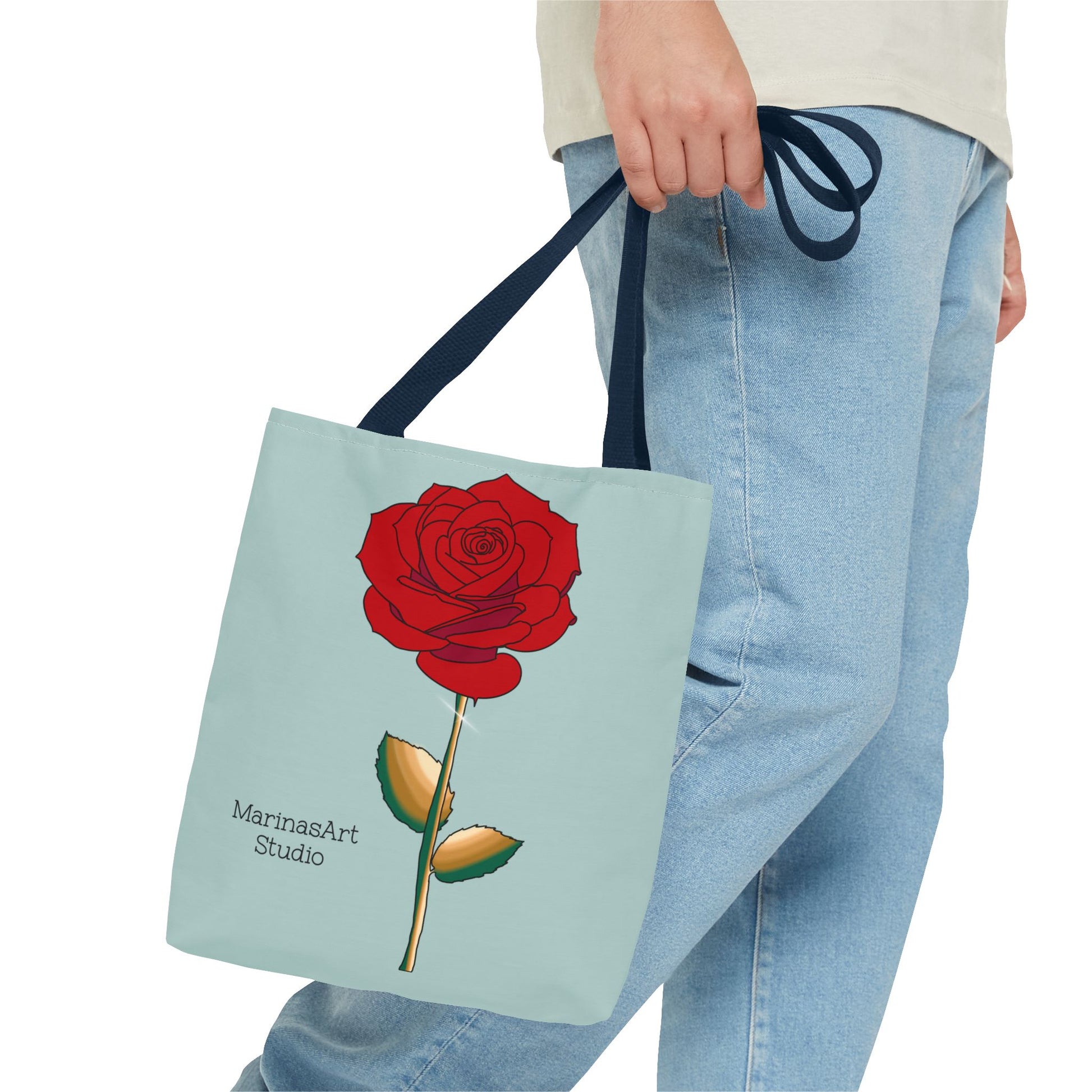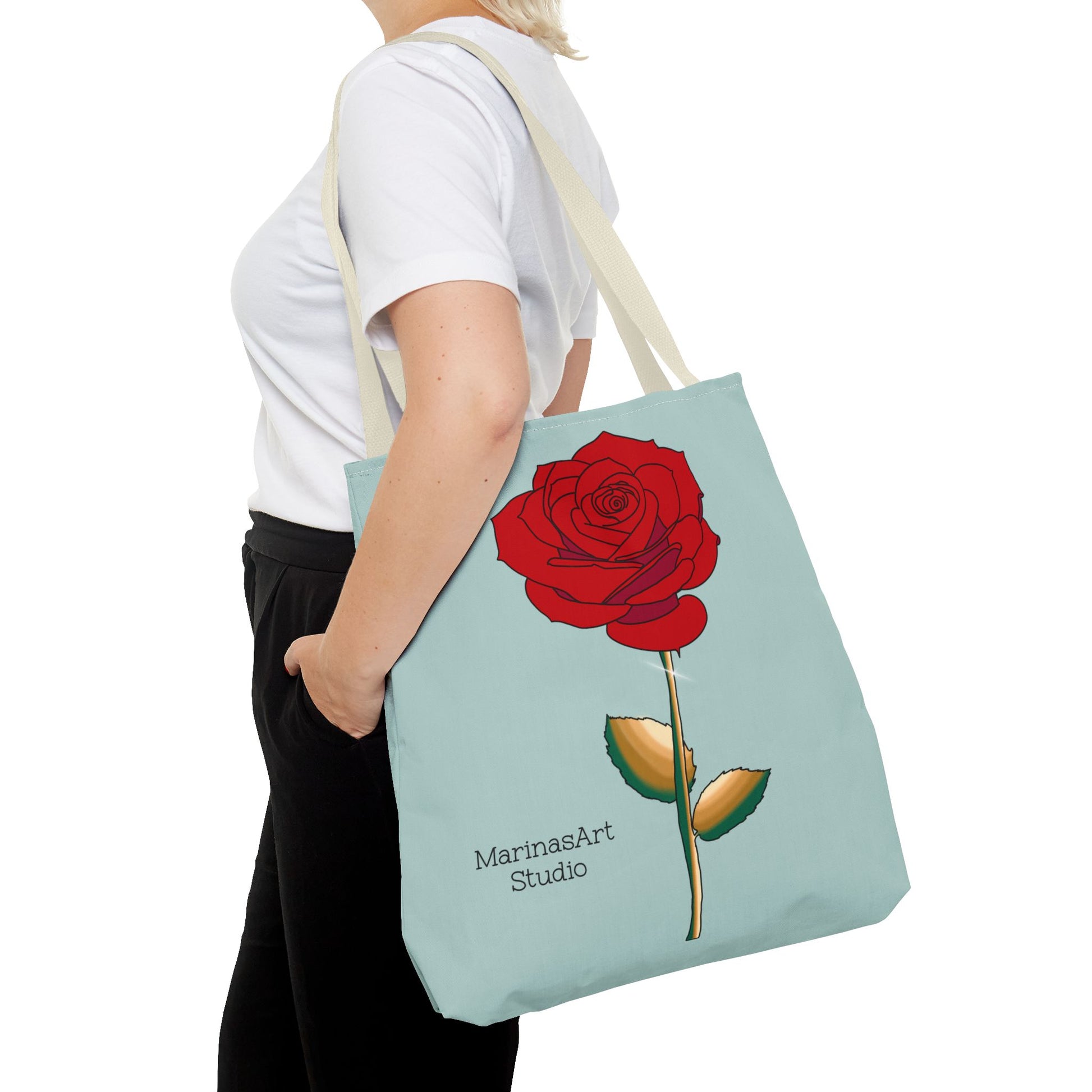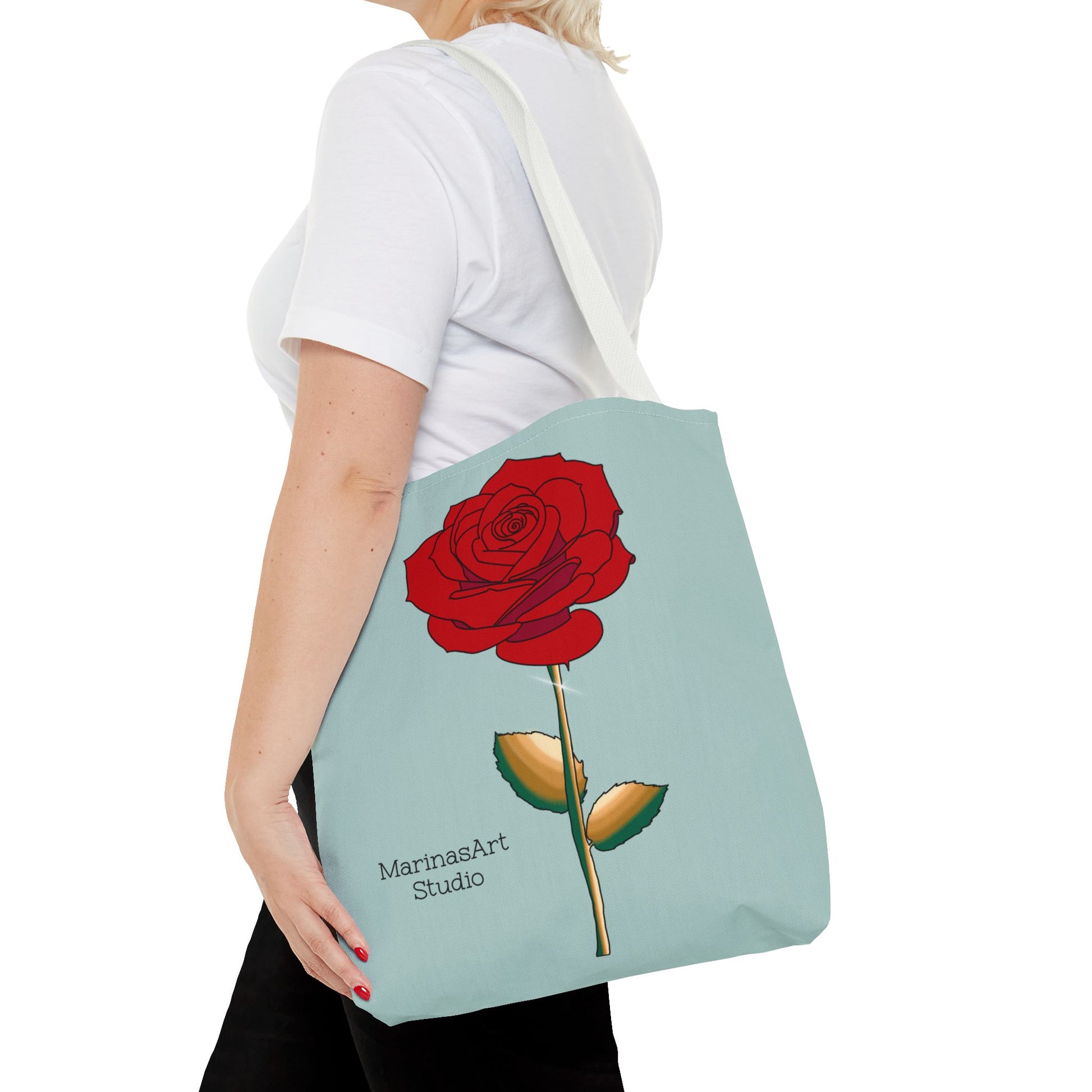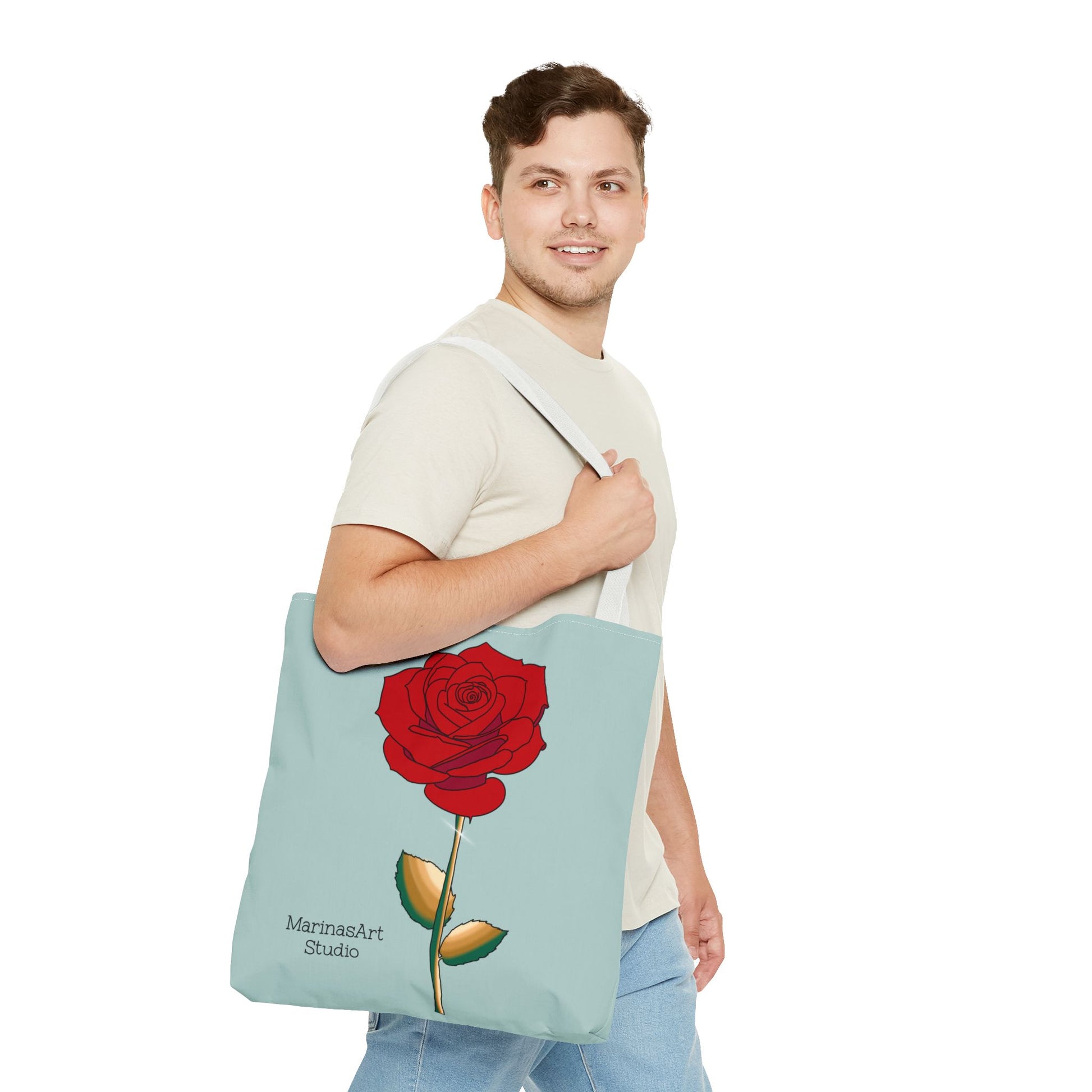 Available in 3 sizes to add both functionality and style, this ruby red rose tote bag comes in multiple handle colors that compliments the design. Made with spun polyester, these bags feature double-stitched seams, cotton webbing straps, and nonwoven laminate lining for high-end durability. It is perfect for all beach trips, shopping excursions, etc. Handle colors come in beige, black, navy blue, and white.