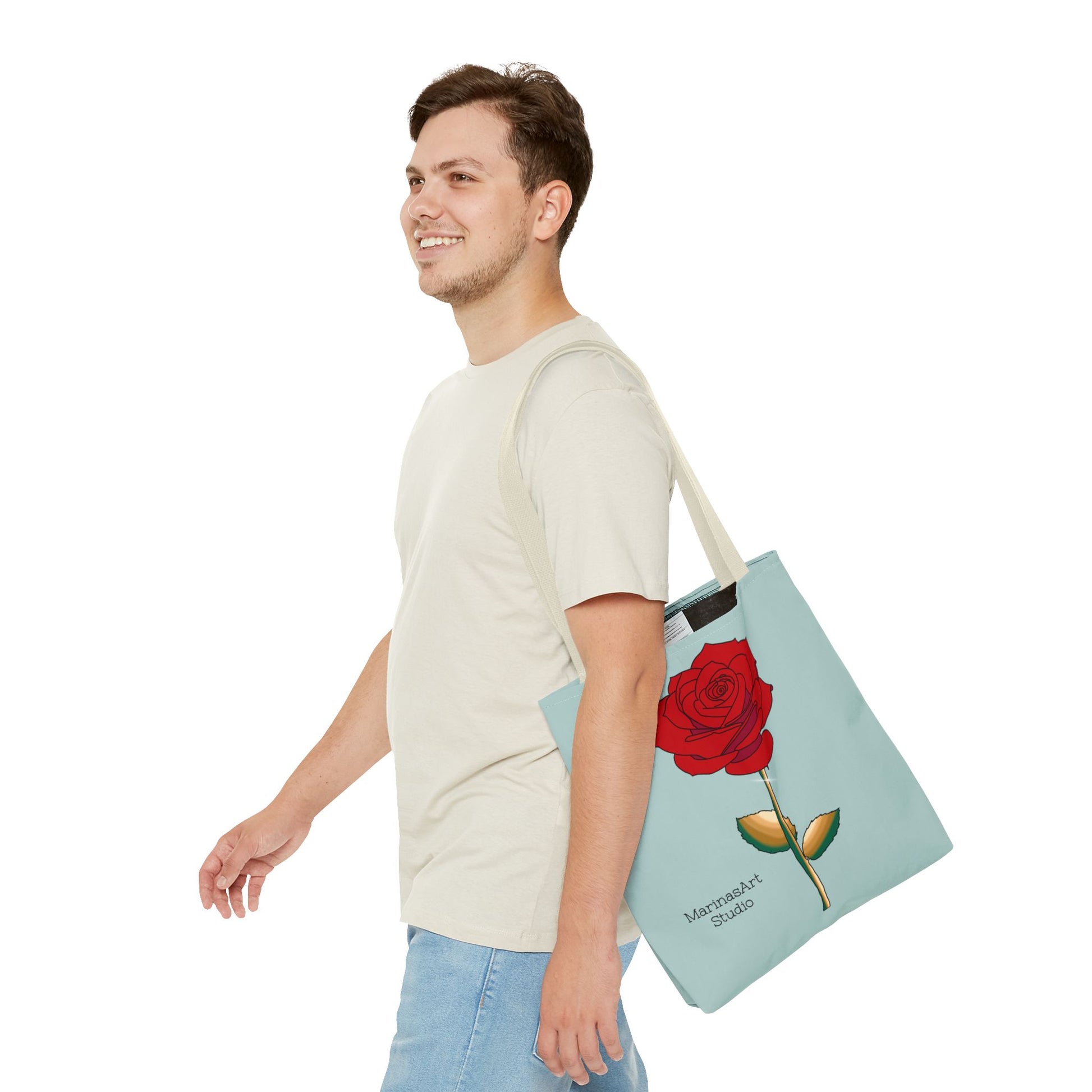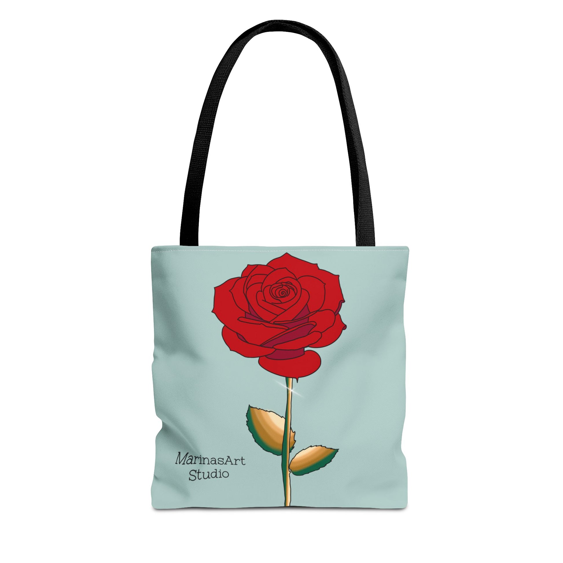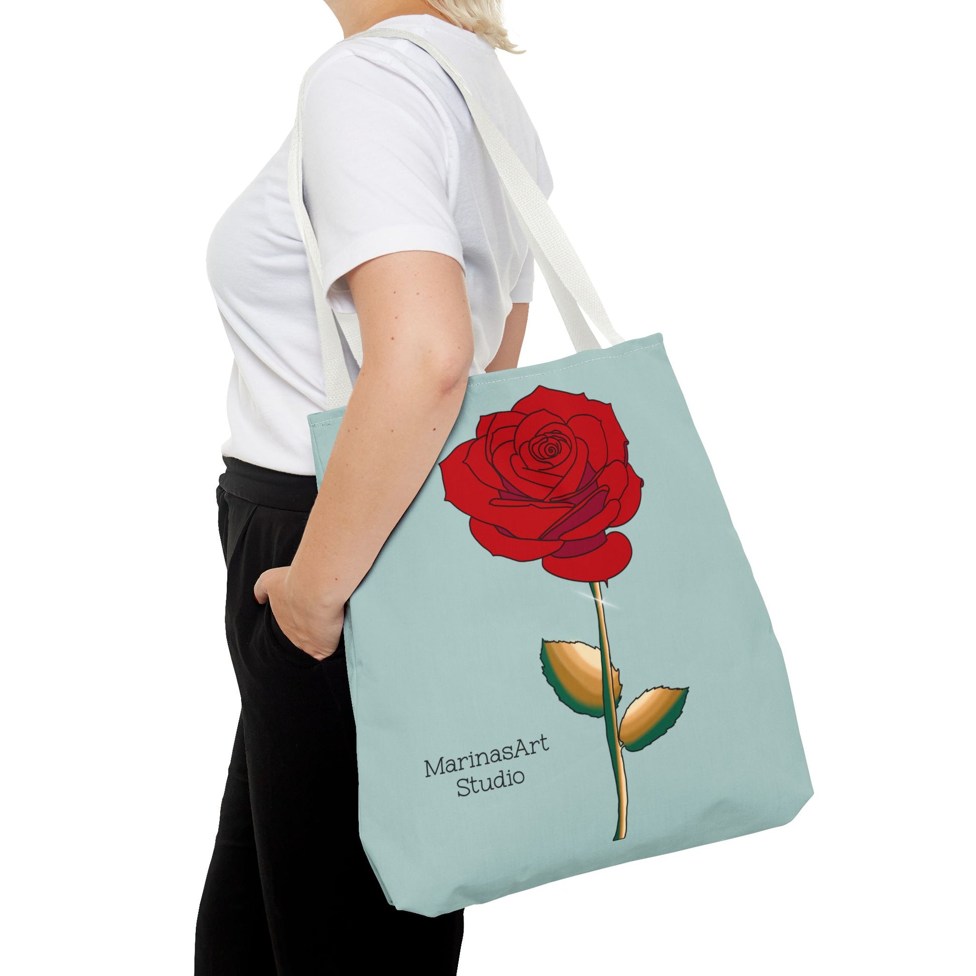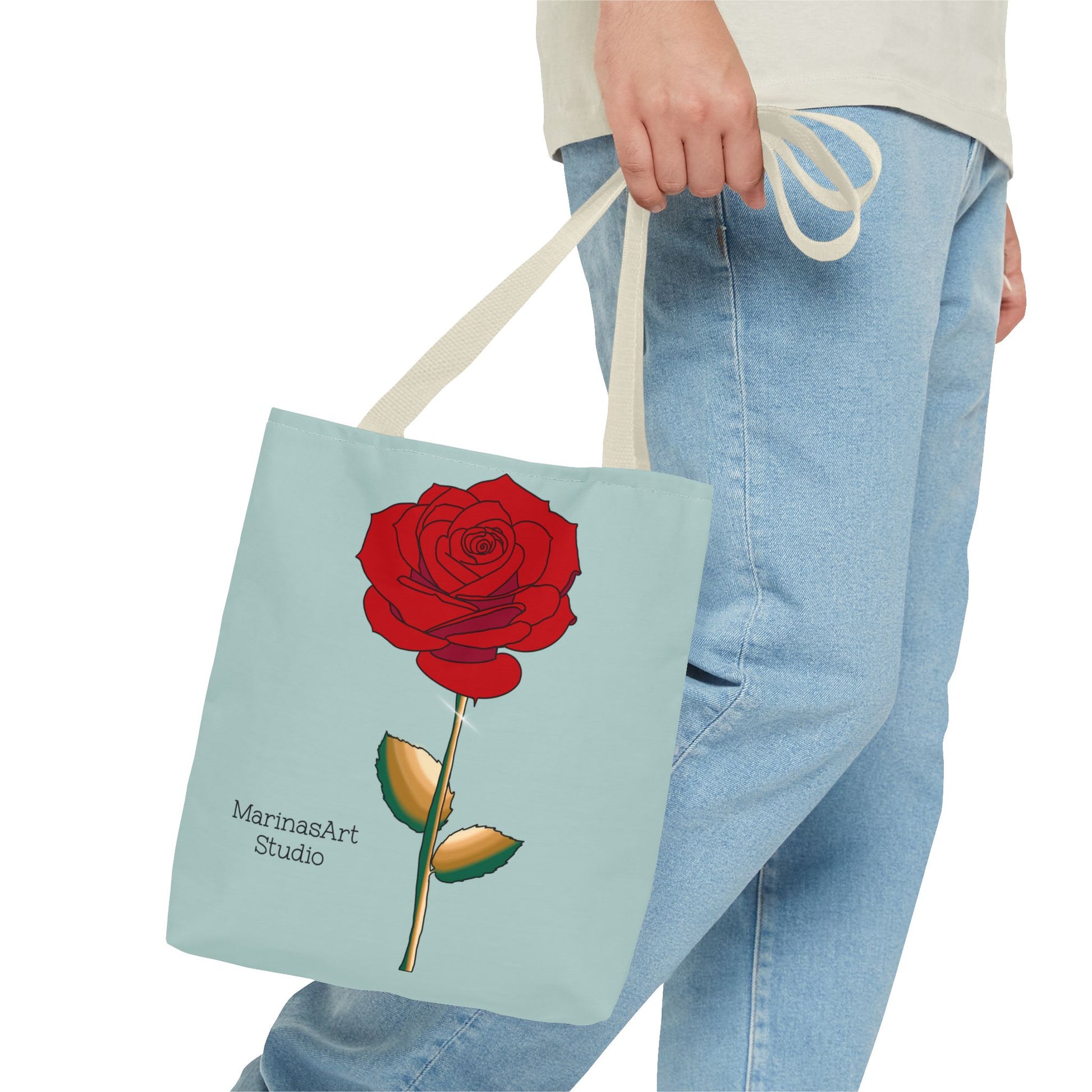 Available in 3 sizes to add both functionality and style, this ruby red rose tote bag comes in multiple handle colors that compliments the design. Made with spun polyester, these bags feature double-stitched seams, cotton webbing straps, and nonwoven laminate lining for high-end durability. It is perfect for all beach trips, shopping excursions, etc. Handle colors come in beige, black, navy blue, and white.